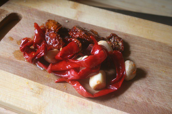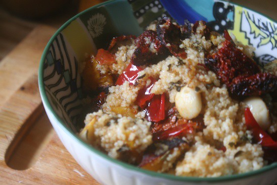 If your grocery store has an “olive bar” with olives, garlic, cornichons (little pickled cucumbers), and the like, reach for some sun-dried tomatoes, a few cloves of garlic and a few peppers. (You should also be able to find this stuff in a jar in the section near the tomato sauces in your store, if they don’t have that antipasto bar.) A cup of this stuff for every half-cup of couscous you’re cooking. Drop ’em on your cutting space, chop ’em up, then throw them in your couscous, in its pot, with a tablespoon of dried oregano and a pinch of salt.