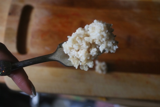 Wipe the bottom of you pot with your oil, then pour in your water. Bring it to a boil, then pour your couscous inside. Turn off your heat, cover your pot, and leave it for five minutes. The little granules will absorb the water, making them puff up and become fluffy. Use your fork to stir it up. It’ll probably double in size again after that.
