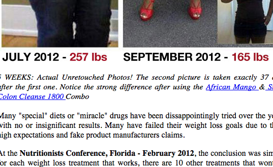 So, I was just strolling along, minding my business, avoiding all the Halloween-y tricks and treats du jour, when I thought to myself, “Self, if I were to come upon a website promoting a weight loss product, how would I know whether or not it was a scam?” And, with that thought, I went hunting. Looking for clues that would lead me to conclude that a website was, in fact, a scam. Before too much time could pass, the hunter found her prey.