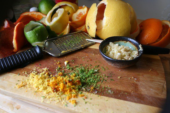 You’re going to take a zester, and scrape the colored part off the rind, trying your best to avoid the bitter white pith beneath it.