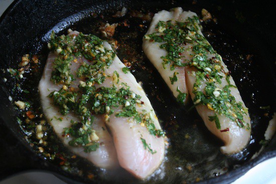 On medium heat – literally, maybe a 6 out of 10 – lay your fillets in the pan carefully. Let them cook to the point where they practically look done, except for the top. You’ll know this because the more they cook, the more opaque and “solid” they look. Eventually, only the very top will look uncooked. At this point – and only at this point – flip them over for about a minute. This way, I get the full fillet cooked, but I don’t drain out the freshness in the herbs too much.