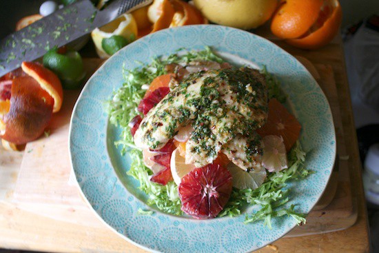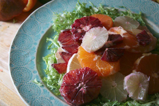 Grab whatever leafy greens you’ve got on hand. I had frisée – which was the result of my “buy something you’ve never tried before” challenge that I do once a month – so that’s what I used. Too keep it from feeling hella dry, I mixed a teaspoon of oil with a tablespoon of apple cider vinegar and a teaspoon of water together to make a quick dressing for it. Pour that over your leaves, and rub it in a bit. Add a pinch of salt, and start putting your citrus fruit on top. It might break apart, but whatever. It’s all going to the same place. (Also: Be smarter than me – chop up some extra cilantro and toss it with a teeny pinch of salt and sprinkle it over your citrus salad. I was rushing, and forgot.)