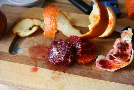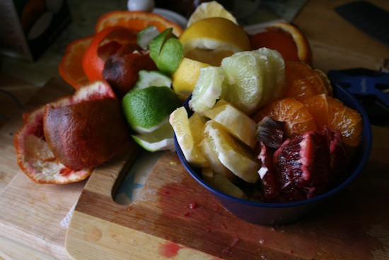 I ran off to the store and grabbed three of every citrus fruit I could find – one for each person. Lemons, limes, grapefruit, blood oranges, navel oranges, valencia oranges… I just kinda went for it. Brought them home, skinned them all with a paring knife.