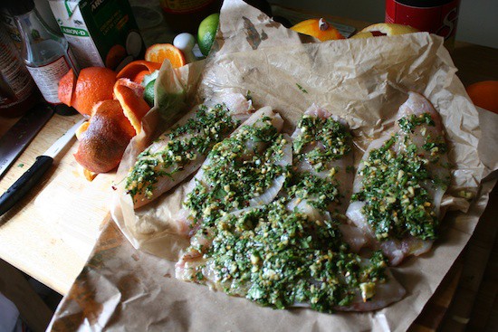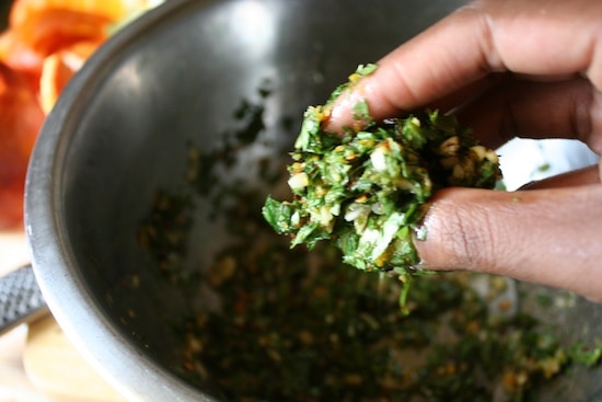 Grab your bunch of cilantro. Cut off a nice, giant chunk of it, and chop it down. It doesn’t have to be a fine cut, but you do want it to be cut pretty nicely. Drop all your zests, a pinch of salt, a shake or two of crushed red pepper, a tablespoon and a half of organic canola oil, a fat pinch of cilantro, and a tablespoon and a half of apple cider vinegar. Slosh it all around with your hands – yes, with your hands – and make your rub.