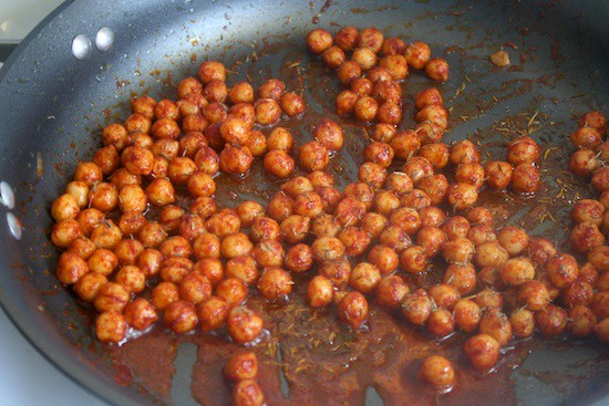 At this point, grab two cans of chickpeas (also known as garbanzo beans), and a tablespoon or organic canola oil. Pour your oil into a skillet, and drain your cans of beans so that very little excess liquid gets in your skillet.