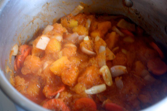 Add in your makeshift mirepoix – celery, carrots and onions is a mirepoix – to your squash, and let it cook some more; for about long enough as it takes for you to prepare your food processor or your potato masher.