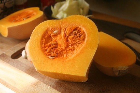 People love to roast butternut squash on its own with different herbs – rosemary, thyme, parsley – or mash and blend it up into soups. There’s also this recipe, photographed above, where you use the quartered skins of the squash to serve as stuffed boats with awesome stuff like apricots, almonds, parsley and honey. More on that, later.