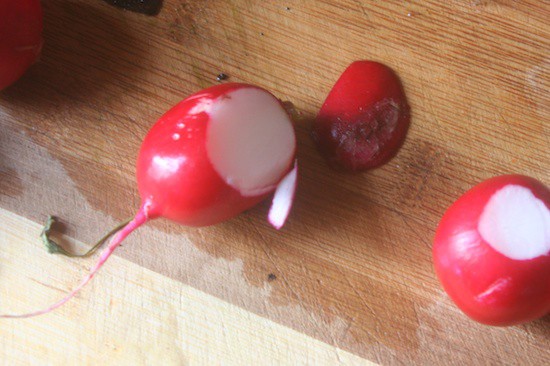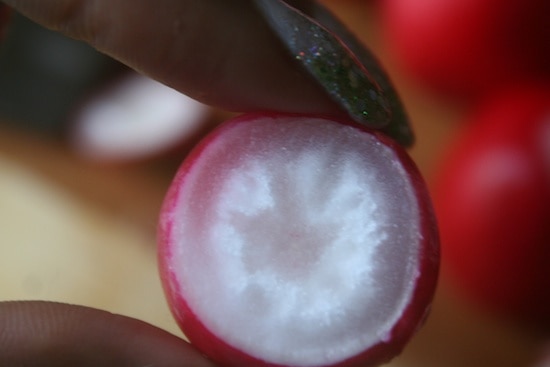 See this? That’s what a weak radish looks like. Terribly soft, feels more like clay than it does a vegetable. The inside is translucent. When it looks like that, don’t eat it.
