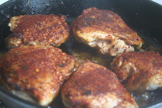 Those are chicken thighs rubbed in ancho powder, paprika and crushed red pepper seasoning.