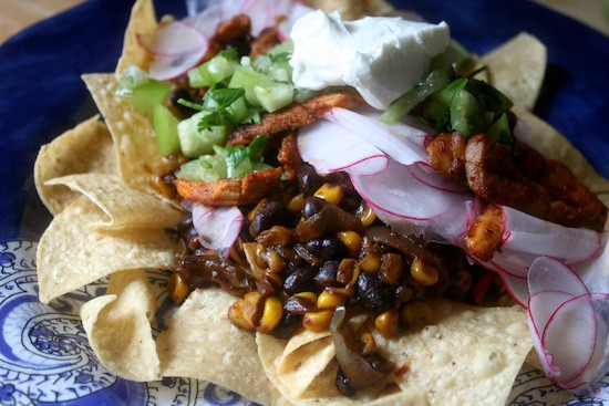 Chips. Corn salsa. Shaved radishes. Protein. (In my case, chicken.) Additional salsa – in my case, since tomatillos were on sale, I mixed four tomatillos with a handful of chopped cilantro and a half-teaspoon of minced garlic – approximately 1 clove. Dollop of greek yogurt.
