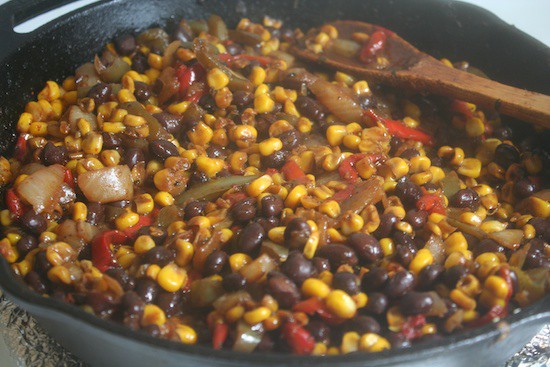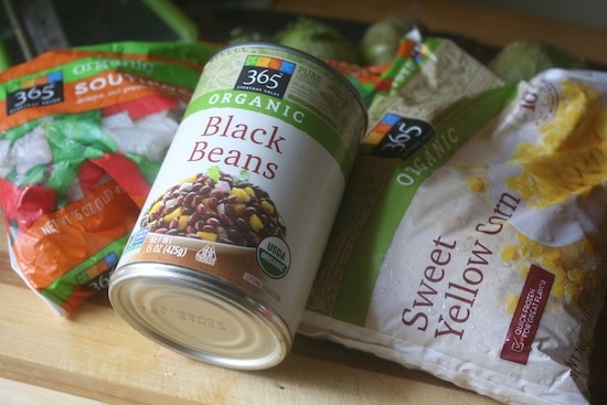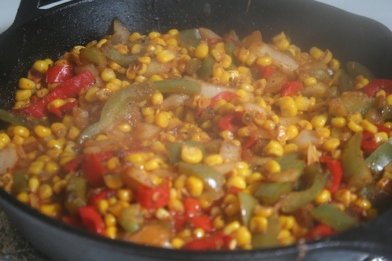 You’re also gonna need some organic corn (I always purchase my corn organic; if it’s not organic, it’s GMO 95% guaranteed.), some peppers and onions, and a can of black beans. Luckily, the veggies are available frozen for cheap (most major store brands have their own line of frozen foods, and don’t worry – they’re still great quality even if its not some big fancy brand), and the beans were on sale. Yay.