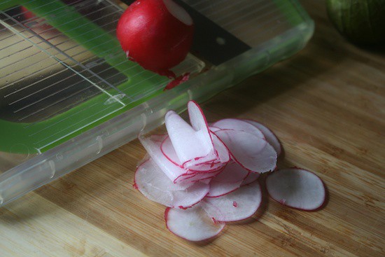 Take your radishes and, with a little inexpensive store-bought mandoline (or your very sharp knife), cut your radishes into slices.