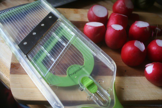 Take your radishes and, with a little inexpensive store-bought mandoline (or your very sharp knife), cut your radishes into slices.