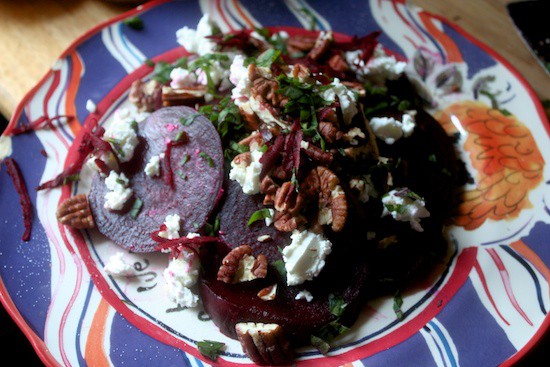 Grab 3 tablespoons of goat cheese (gasp, ew, gross, I know…it’s still delicious), a small handful of chopped parsley (no parsley? Take one of those beet leaves and chop it up!), and a half a cup of pecans. Just… throw it at the plate. It’ll look great. I promise.