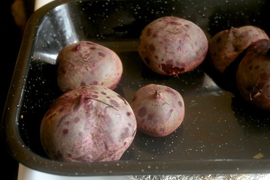 Beets are easy. Put them on a pan, face down, and roast them. 400 degrees, 35 minutes.