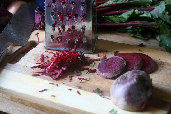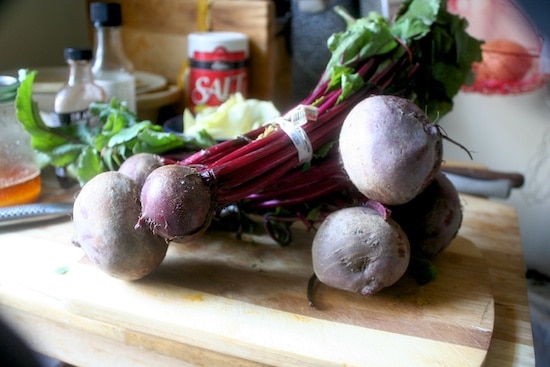 The nice thing about beets, is that you get two separate servings out of ’em – you turn the beets into one thing, and those gorgeous green tops into something completely different. You can, essentially, treat those tops like collard greens and braise them at your discretion, use them for wraps, or saute them as a side. Your choice.