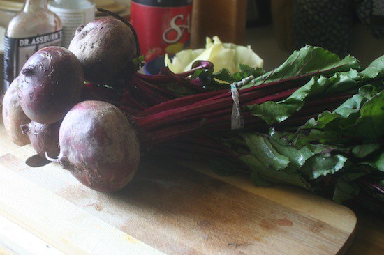 The nice thing about beets, is that you get two separate servings out of ’em – you turn the beets into one thing, and those gorgeous green tops into something completely different. You can, essentially, treat those tops like collard greens and braise them at your discretion, use them for wraps, or saute them as a side. Your choice.