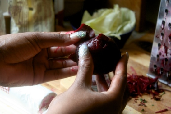 When they’re roasted, let them cool. Once cooled, press your hand against the flesh of the beet to peel it off.
