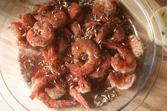 Take 1 tablespoon of fennel seed (that’s the stuff you see that looks like, well, seeds), a teaspoon of cumin, two teaspoons of paprika (smoked, if you can swing it), a teaspoon of black pepper (a third if it’s from a grinder), and a half-teaspoon of ground clove and just douse your shrimp with it. Try to evenly cover the entire plate with all of your spices.
