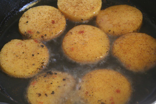 Cook your grits with just water on the pot, then spread them onto a pan and let them cool off. You can then use a cookie cutter to get as many medallions as you want. 🙂
