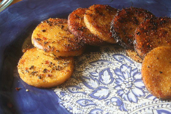 I picked up a roll of polenta – not quite that kind – from a local purveyor at the store, and hadn’t used it yet. It didn’t have any fat in it, and was made specifically for cutting into slices.