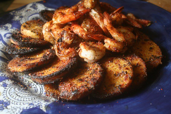 I’ve always felt guilty about the way I made my grits – I add heavy cream, any cheese I’m particularly interested in that day, and – depending on the recipe – butter. Basically, the way I make them… I can’t eat them often. But, I thought to myself, what if I make the grits with nothing but water, cut it into slices, and lightly fry the outsides? Crispy and spicy on the outside, soft and chewy on the inside? Since we also had shrimp on deck from an earlier night – when it’s on sale, we go a little crazy and stock up – I figured I could stack the plate.