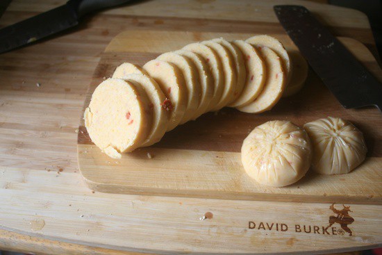 I grabbed my roll, and sliced up into medallions that were about a third of an inch wide. If you stacked about five quarters on top of each other, that’s about how wide these were sliced.