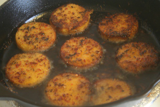 By my approximation, you should’ve only been able to cook half of your medallions at once, so go ahead and repeat the entire process for the other half of your stash. Same thing – the only difference is that you’ll be pouring your oil into a hot pan. Do this, but do it carefully. I pour my oil down the side of the pan, so as to best avoid splatter.