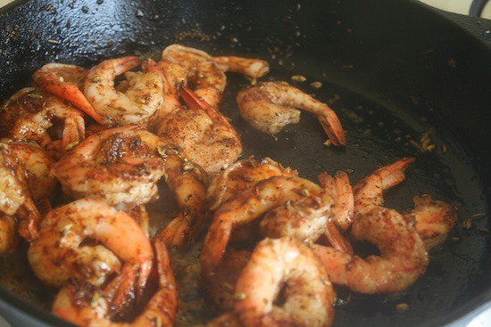 It really doesn’t matter how you spice them and, no, it doesn’t matter whether you cover both sides of the shrimp because they’re all going to be tossed into the skillet together and turned on top of each other, which is where spices will rub off everywhere. Mmmmmm. Nummy.