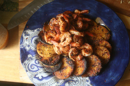 I’ve always felt guilty about the way I made my grits – I add heavy cream, any cheese I’m particularly interested in that day, and – depending on the recipe – butter. Basically, the way I make them… I can’t eat them often. But, I thought to myself, what if I make the grits with nothing but water, cut it into slices, and lightly fry the outsides? Crispy and spicy on the outside, soft and chewy on the inside? Since we also had shrimp on deck from an earlier night – when it’s on sale, we go a little crazy and stock up – I figured I could stack the plate.